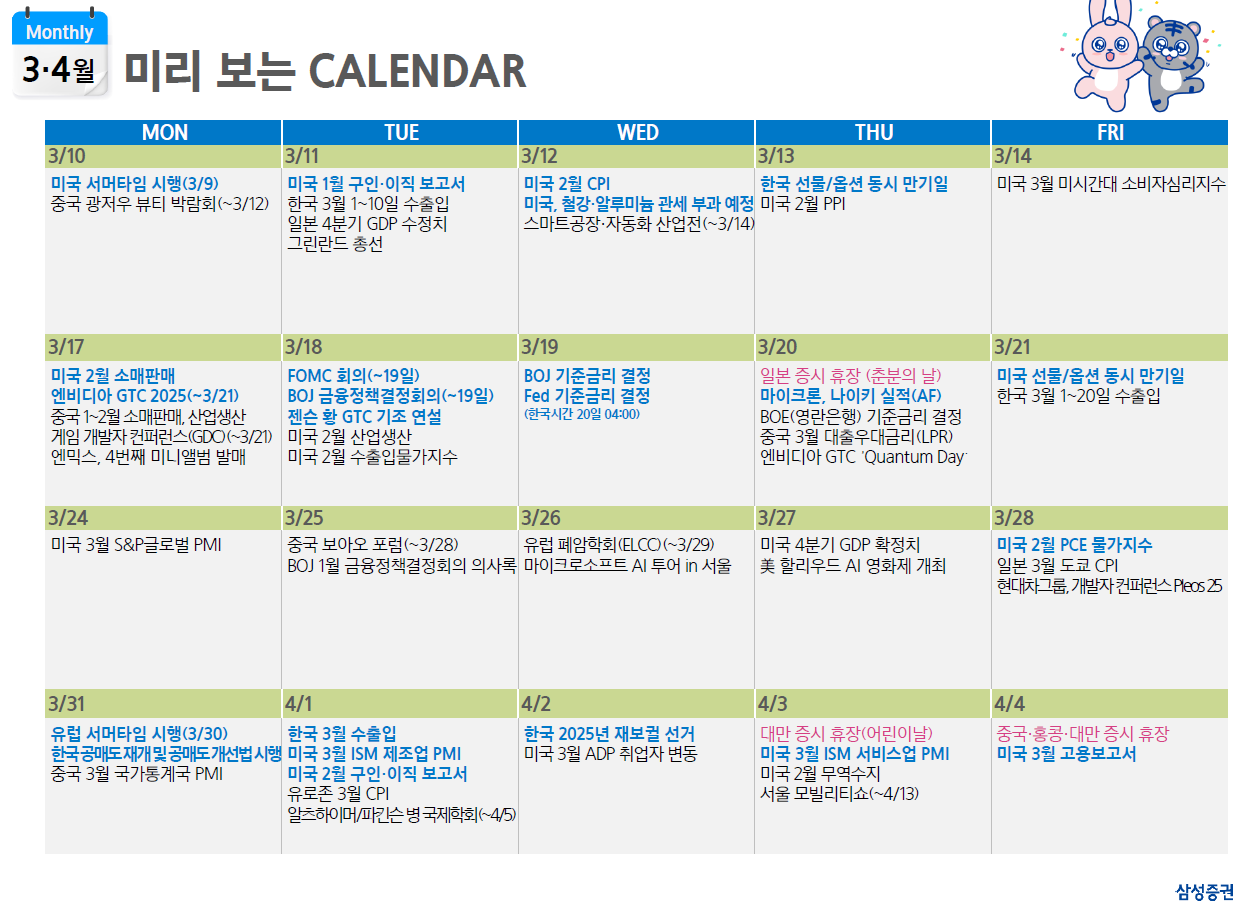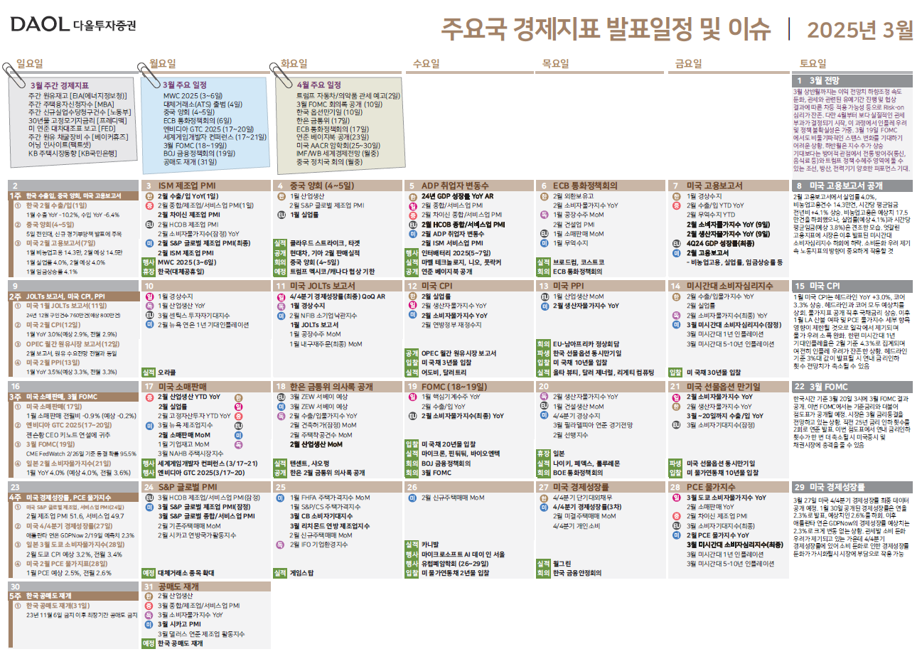 이런 가운데 개인투자자 심리지수에서 6개월 후 지수 하락 전망이 지난 주 60.6%에서 57.1%로 소폭 개선됐지만, 여전히 역사적 평균인 31.0%를 크게 상회. 이렇듯 투자 심리가 위축된 점도 주식시장에 부담. 다만, 장중 트럼프가 멕시코 대통령과 합의해 USMCA 범위에 있는 제품에 대해 4월 2일까지 관세 면제에 합의 했다고 발표한 데 이어 장 마감 앞두고 캐나다에 대한 관세 부과 유예 발표로 낙폭이 일부 축소. 그러나 트럼프는 이와함께 철강과 알루미늄은 다음 주 관세를 부과할 것이며 4월 2일 가장 큰 규모의 관세를 부과할 것이라고 발표하며 불안감은 여전히 진행.