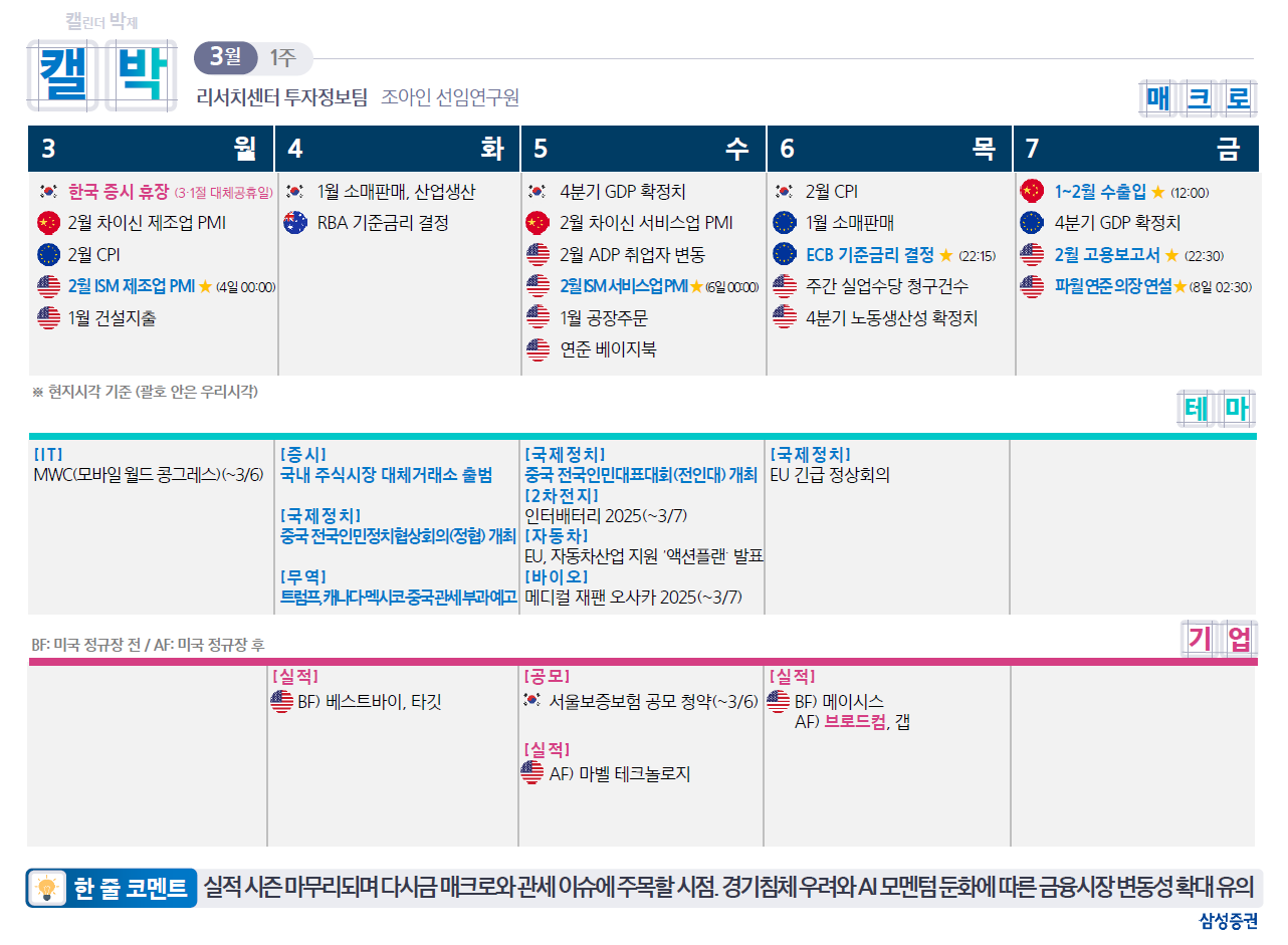 시장은 DOGE 여파가 2월보다는 3월에 반영될 것으로 추정하고 있지만, 이번 지표 결과를 보면 금요일에 반영될 수 있음을 보여줌. 이 경우 금요일 고용보고서에서 비농업고용자수가 지난달 14.3만 건에서 약 16만 건으로 개선 기대와 달리 오히려 크게 둔화될 수 있음을 보여주고, 이는 경기에 대한 불안을 확대. 더불어 소매업체 해고자수도 4만 5,375건으로 급증해 소비 둔화 우려 또한 확대. 이 여파로 금융주와 산업재가 약세를 보인 가운데 반도체 등 기술주에 대한 투자심리도 위축시켜 시장에 불안 요인으로 작용