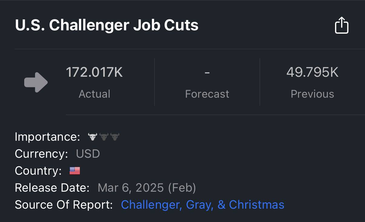 미국 Challenger 해고자 지수, 🇺🇸 2월 챌린저 감원 수치는 예상치를 큰 폭 상회한 172k