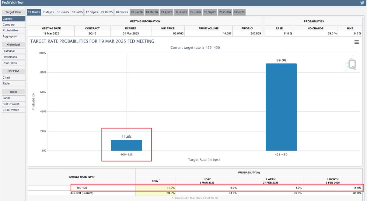 오늘 미 증시 하락에 3월 금리 인하 가능성이 11%까지 상승했고, 5월 인하 가능성은 50%를 상회
