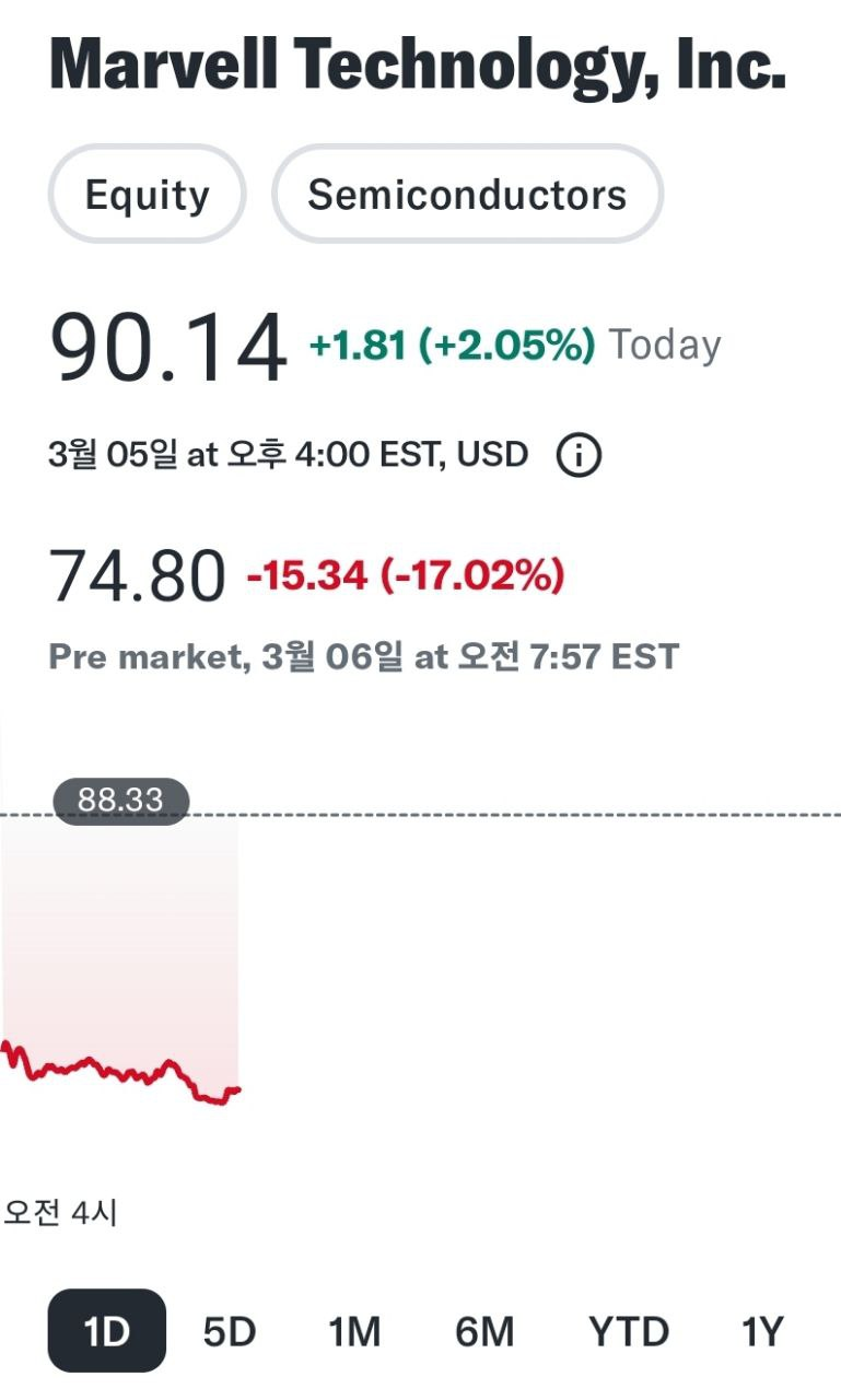 [개장 전] 어제 장 마감 후 실적을 발표한 마블테크놀로지가 급락하며 개장 전 반도체를 중심으로 나스닥 하락을 이끌어냄.