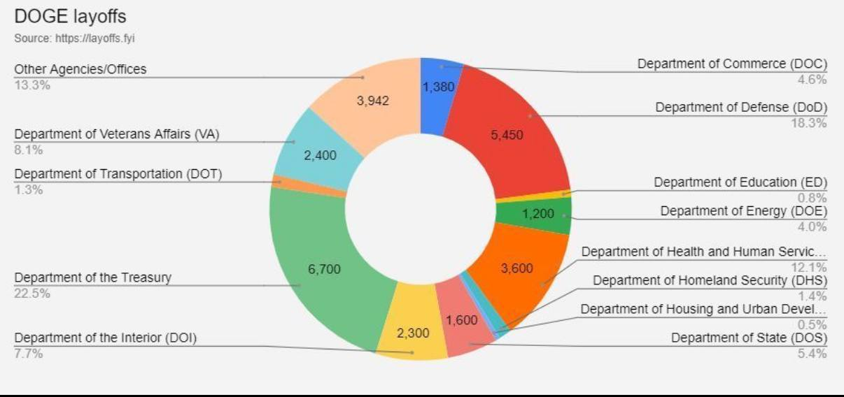 - 2025년 첫 두 달 동안 연방 정부는 62,530명을 해고했으며, 이는 전년 동기 대비 41,311% 증가한 수치다.