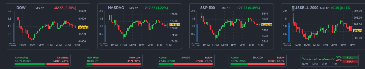 [개장 후] 03/13 나스닥, 안정된 소비자 물가지수에도 관세 이슈로 변동성 확대 후 결국 상승 마감