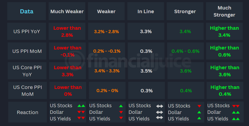 PPI, PPI 3.2% YoY, (Est. 3.3%), PPI 0% MoM, (Est. 0.3%). PPI Core 3.4% YoY, (Est. 3.5%), PPI Core -0.1% MoM, (Est. 0.3%)
