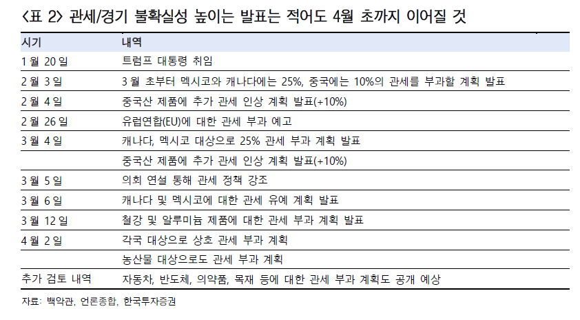 단순히 초점이 관세에서 벗어난 게 아니라 트럼프 정부의 관세 정책이 질서를 잡아가고 있다는 점까지 감안하면, 관세 불확실성은 정점을 형성했다고 보는 게 맞을 것