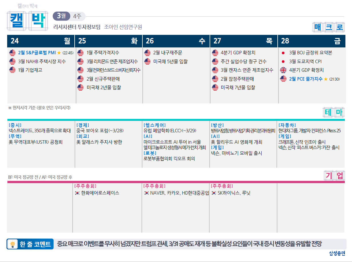 - S&P 글로벌 서비스업 PMI, 3 월 S&P 글로벌 제조업과 서비스업 PMI 는 각각 49.8pt 와 54.3pt 로 제조업 컨센 하회(51.8pt), 서비스업 상회(50.8pt). S&P 글로벌은 서비스 부문이 제조업 부진을 상쇄하는 양상이라 평가. 또한 기업들이 고객 수요 둔화 및 행정부 정책 영향에 대한 우려를 이러한 흐름의 주 원인으로 지목하고 있음을 강조