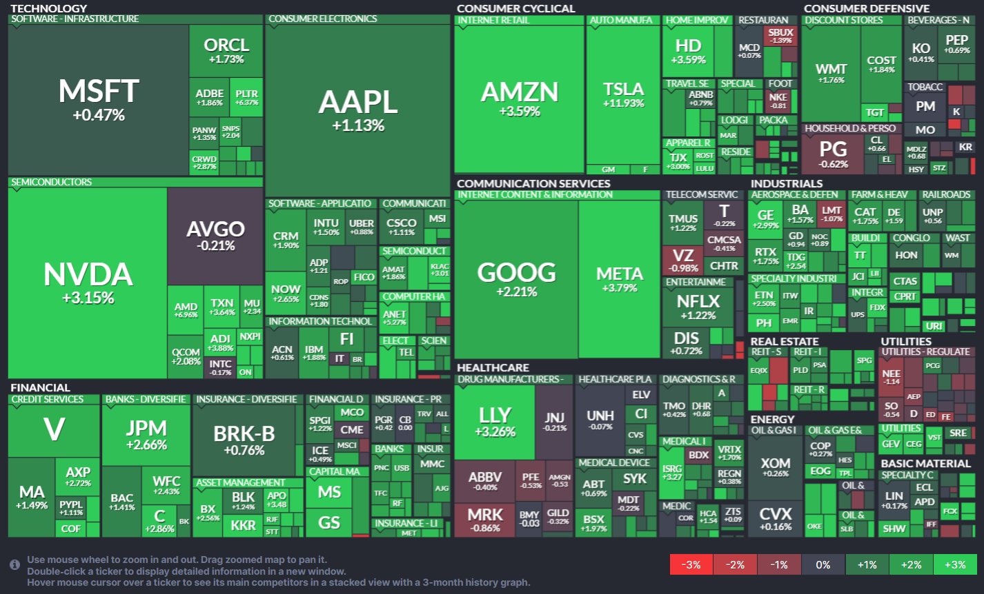 11 개 섹터 중 유틸리티를 제외한 전 업종 상승 마감. 그간 트럼프 정책에 대한 불안과 실망으로 부진했던 테슬라(+11.9%), 팔란티어(+6.4%) 등 트럼프 트레이드 종목들이 강하게 반등. M7 종목들(MAGS, +3.3%)도 강세. 경기소비재(+4.1%), 컴스(+2.1%), 산업재(+1.9%) 등이 아웃퍼폼. 관세에 따른 비용 압박과 불확실성에 취약했던 중소형주(러셀)도 급등