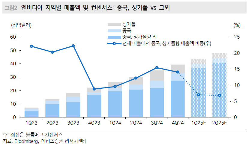 1Q25 엔비디아 매출액 가이던스 및 컨센서스는 430억 달러, 순이익 컨센서스는 231억 달러. 55억 달러의 비용 인식(손실)은 1Q25 예상 매출액 대비 12.7%, 순이익 컨센서스 대비 23.8%에 해당하는 수준. 4Q24 중국향 매출액이 55.3억 달러이며 1Q25 컨센서스는 30억 달러. 중국으로 우회 수출되는 것으로 추정되었던 싱가폴향 매출액까지 더한 중국+싱가폴향 매출액 1Q25 컨센서스는 65억달러