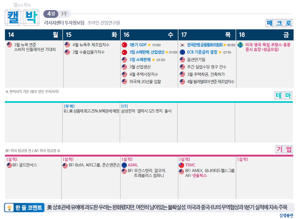 [개장 후] 미 증시는 DOW -1.33%, S&P 500 +0.13%, NASDAQ -0.13%, Russell +0.92%로 혼조세. 반도체 업종(-0.7%)이 나스닥을, 유나이티드헬스(-22.4%)가 다우의 부진으로 이어진 가운데 S&P 는 중형주 및 개별 종목 강세로 견조. 18 일 휴장을 앞둔 상황에서 옵션만기일을 맞아 종목 장세 출현. 관세 관련해서는 트럼프 대통령과 일본, 이탈리아 국가와의 무역 협상 기대감 있었으나 유의미한 소식은 부재. 중국을 대상으로는 여전히 강경한 스탠스 유지. 금리 인하 단행한 ECB 통화정책회의에서 제시된 성장률에 대한 우려도 증시의 하방압력으로 작용. 거대 채권운용사인 PIMCO 가 미국 자산에 대한 비중 축소를 권고한 점도 부담