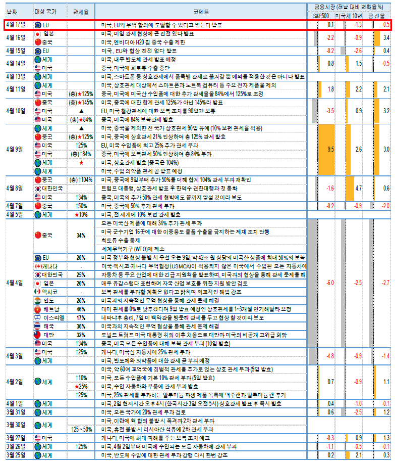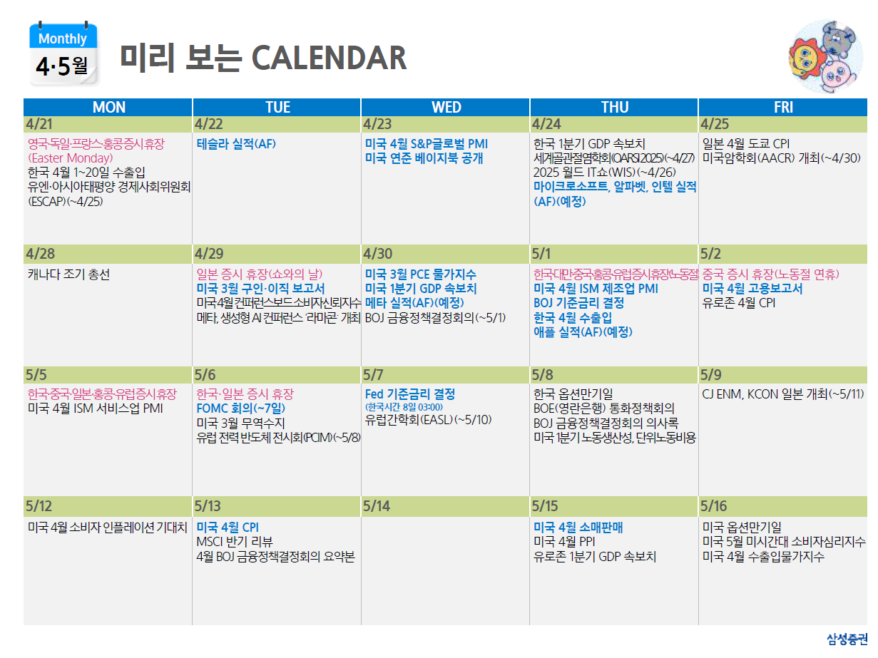 미 국채 금리는 2Y 3.80%(+2.9bp), 10Y 4.32%(+4.8bp)로 베어 스티프닝 발생. [EU 와 PIMCO 가 미 국채에 대한 신뢰 하락을 시사하자 장기물 중심의 매도세 발생]. PIMCO 는 미국의 보호무역주의 정책 변화로 미국 투자환경에 대한 재평가가 이뤄지고있음을 강조. 더해 달러가 기축통화로, 국채를 주요 준비자산으로 보유하는 것이 보장된 것이 아님을 경고.