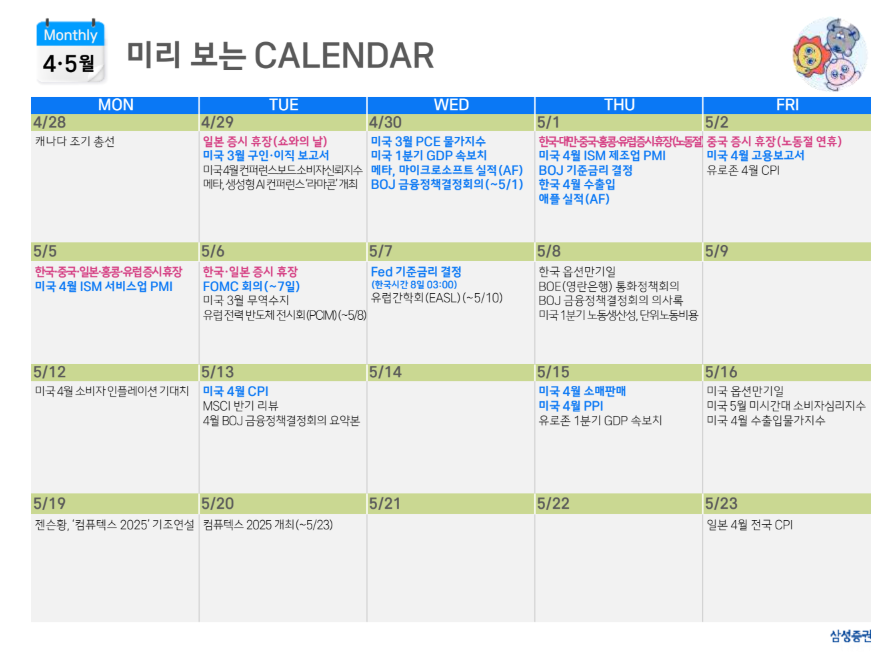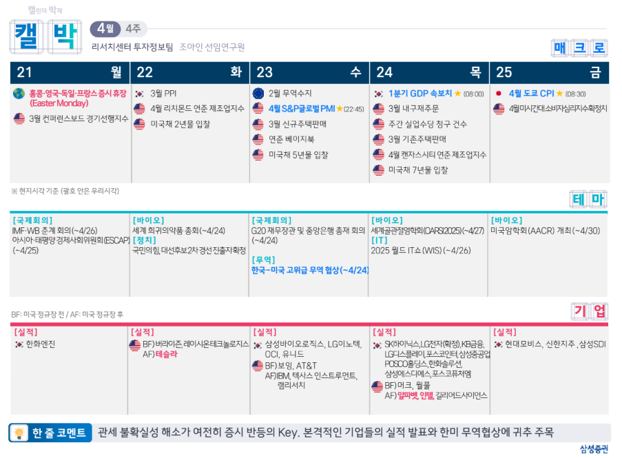 04/23(수) 한국: 소비자동향조사 독일: 제조업, 서비스업 PMI 유로존: 제조업, 서비스업 PMI, 수출입 동향 미국: 제조업, 서비스업 PMI, 신규주택판매 보고서: 베이지북 채권: 미 5년물 국채 입찰 발언: 굴스비 총재, 월러 연준이사, 베일리 BOE 총재 실적 장전: 필립모리스(PM), AT&T(T), 써머피셔(TMO), 보스턴 사이언티픽(BSX), 넥스트라에너지(NEE), 보잉(BA), GE버노바(GEV) 실적 장후: IBM(IBM), 서비스나우(NOW), 텍사스인스트루먼트(TXN), 램리서치(LRCX), 오리얼리 오토모티브(ORLY), 뉴몬트(NEM), 치포슬 멕시칸 그릴(CNG) 04/24(목) 한국: GDP 성장률 독일: Ifo 기업환경지수 미국: 국가활동지수, 내구재주문, 기존주택매매 채권: 미 7년물 국채 입찰 발언: 카시카리 총재, 게오르기에바 IMF 총재 실적 장전: P&G(PG), 머크(MRK), 펩시코(PEP), 유니온 퍼시픽(UNP), 사노피(SNY), 브리스톨 마이어스(BMY), 프리포트-맥모란(FCX), 노키아(NOK), 사우스 웨스트 에어라인(LUV), 아메리칸 에어라인(AAL) 실적 장후: 알파벳(GOOG), 길리어드사이언스(GILD), 인텔(INTC)