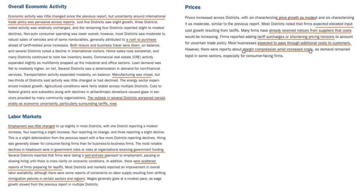▶️ ‘관세’ 용어는 107차례, ‘불확실성’ 단어는 89회 사용▶️ 대부분 지역에서 경제활동의 변화는 미미했지만 성장은 5개 지역에서 소폭 상승했고, 3개 지역에서는 변동이 없었으며, 4개 지역에서는 하락