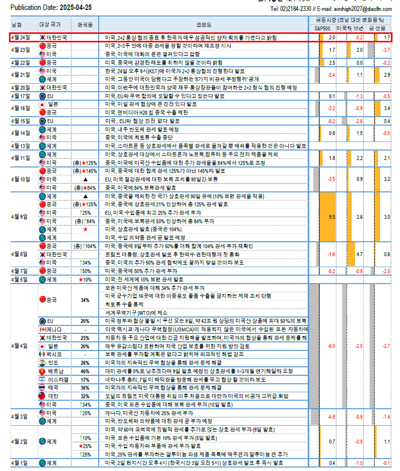 물론, 중국 주미 대사관은 미국과 어떤 협상도 하지 않았다고 주장해 트럼프 발언과 다른 모습. 이런 가운데 중국 인민은행 총재는 미국 관세 남용이 글로벌 경제 성장을 훼손하고 있다고 주장. 더불어 중국은 내수를 성장동력으로 삼고 있으며 이를 위해 지준율 인하 및 정책 금리 인하 정책을 할 것이라고 발표. 결국 미국의 관세 정책에 대한 각국의 대응이 협상, 외면, 비관세 제재 등 여러 정책이 혼재되는 모습장중에는 트럼프가 “관세에 대해 합리적으로 책정하겠다"고 언급하며 관세율 수정 가능성을 시사. 더불어 시장이 관세 정책에 적응하고 있다고 생각하고 있다고 주장. 그러나 트럼프가 곧 이어서 유예된 상호관세에 대한 추가적인 유예 가능성은 낮다고 언급. 더불어 “중국이 우리에게 뭔가를 주지 않는 한 중국에 대한 관세를 낮추지 않을 것이다”, “중국을 개방하는 것은 큰 승리가 될 것이다” 라고 주장. 결국 트럼프는 전체적으로 관세율 전환을 시사했지만, 중국과의 마찰은 지속되고 있음을 보여주는 등 불확실성은 여전