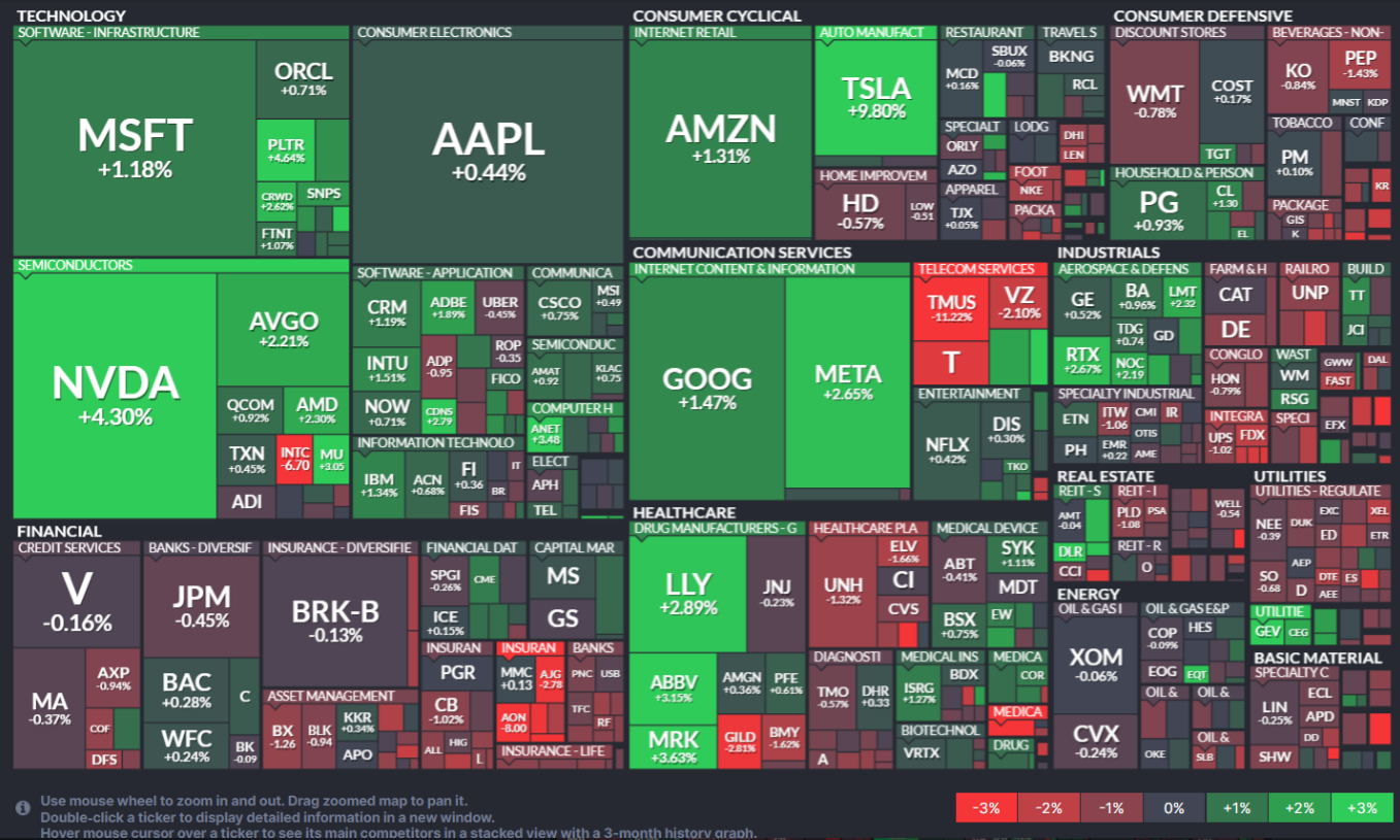 엔비디아(NVDA +4.30%)는 모건스탠리가 추론 컴퓨팅 수요의 급격한 증가를 전망하며 장기 매출 전망치를 상향 조정했다는 소식에 상승했습니다. 전일 아마존의 케빈 밀로가 데이터센터 투자 계획이 크게 바뀌지 않았다고 밝힌 점, 알파벳의 실적 발표에서 자본지출 유지 방침이 확인된 점도 투자심리에 긍정적으로 작용했습니다. 브로드컴(AVGO +2.21%), AMD(AMD +2.30%), 마이크론(MU +3.05%) 등도 동반 상승했고, TSMC(TSM +0.56%)는 관세 이슈로 상승폭이 제한됐습니다. 인텔(INTC -6.70%)은 양호한 실적에도 다음 분기 매출 전망이 예상에 미치지 못했다는 소식과 강력한 경쟁사들로 인해 단기간 내 반전이 어렵다는 BOA의 언급이 부담으로 작용해 큰 폭 하락했습니다. 필라델피아 반도체 지수는 1.03% 상승 마감했습니다25.