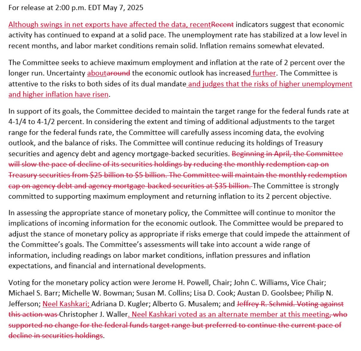 1️⃣ 연준은 예상대로 정책금리를 4.25~4.50%로 만장일치 동결. 성명서에는 경제 전망에 대한 불확실성이 더욱 커졌다면서 높은 실업률과 높은 인플레이션 위험이 모두 증가했다고 밝힘