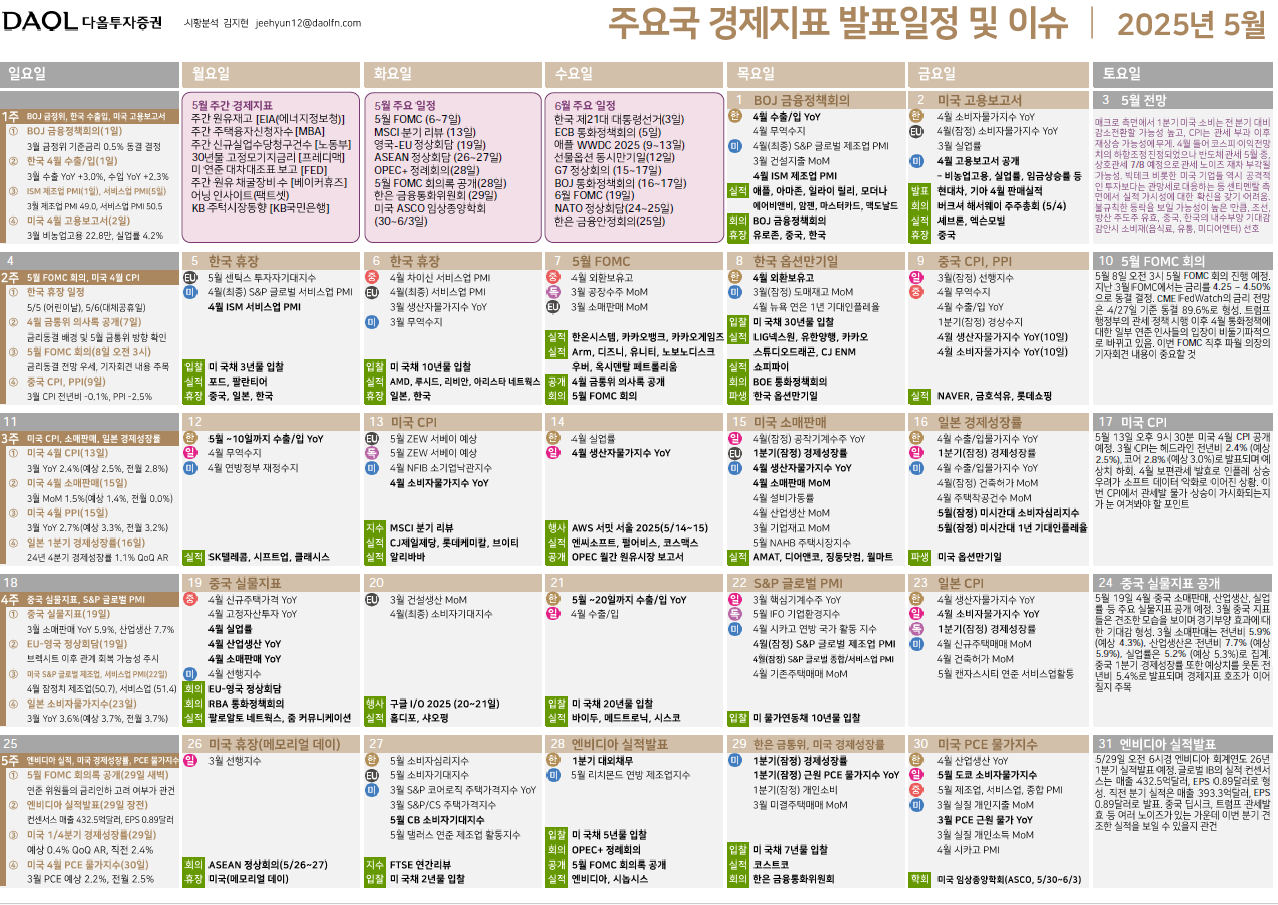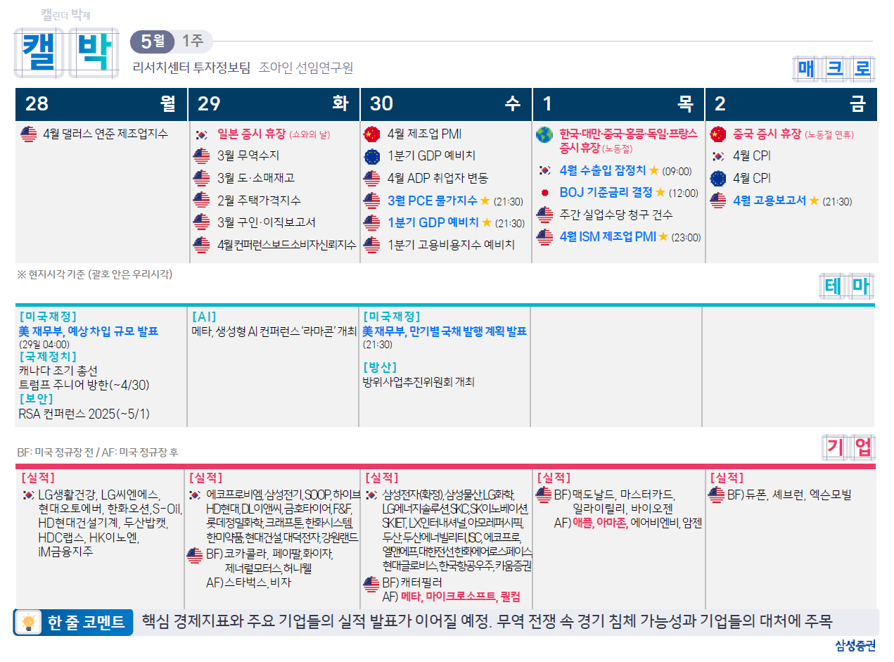 04/29(화) 독일: Gfk 소비자동향 유로존: 소비자신뢰지수 미국: 소비자신뢰지수, JOLTs 행사: 메타플랫폼의 개발자 컴퍼런스(LlamaCon) 실적 장전: 코카콜라(KO), 아스트라제네카(AZN), 허니웰(HON), 화이자(PFE), 스포티파이(SPOT), UPS(UPS), 페이팔(PYPL), GM(GM), 코닝(GLW) 실적 장후: 비자(V), 부킹홀딩스(BKNG), 스타벅스(SBUX), 시게이트(STX), 퍼스트솔라(FSLR), 스냅(SNAP), 쿼보(QRVO) 04/30(수) 한국: 산업생산, 소매판매 중국: 제조업, 서비스업 PMI, 차이신 제조업지수 독일: GDP 성장률, 소비자물가지수 미국: GDP 성장률, 개인소비, 가계지출, PCE 가격지수 채권: 미국 분기별 채권 발행 계획 실적 장전: 캐터필라(CAT), 웨스턴 디지털(WDC), , 오토메틱 데이타(ADP), 엣시(ETSY) 실적 장후: MS(MSFT), 메타플랫폼(META), 퀄컴(QCOM), KLA(KLAC), 크라운캐슬(CCI), 이베이(EBAY), 텔레닥 헬스(TDOC) 05/01(목) 한국: 수출입동향 미국: ISM 제조업지수, 건설지출 산업: 중국, 미국 등 자동차 월간 차량 판매 보고 은행: BOJ 통화정책회의 실적 장전: 일라이릴리(LLY), 마스터카드(MA), 맥도날드(MCD), CVS헬스(CVS), 로블록스(RBLX), 에스티로더(EL), 바이오젠(BIIB), 모더나(MRNA), 쉐이크쉑(SHAK) 실적 장후: 애플(AAPL), 아마존(AMZN), 암젠(AMGN), 마이크로스트레티지(MSTR), 에어비앤비(ABNB), 트와일로(TWLO), 로쿠(ROKU), 라이엇 플랫폼(RIOT) 휴장: 한국, 중국, 독일, 인도 등