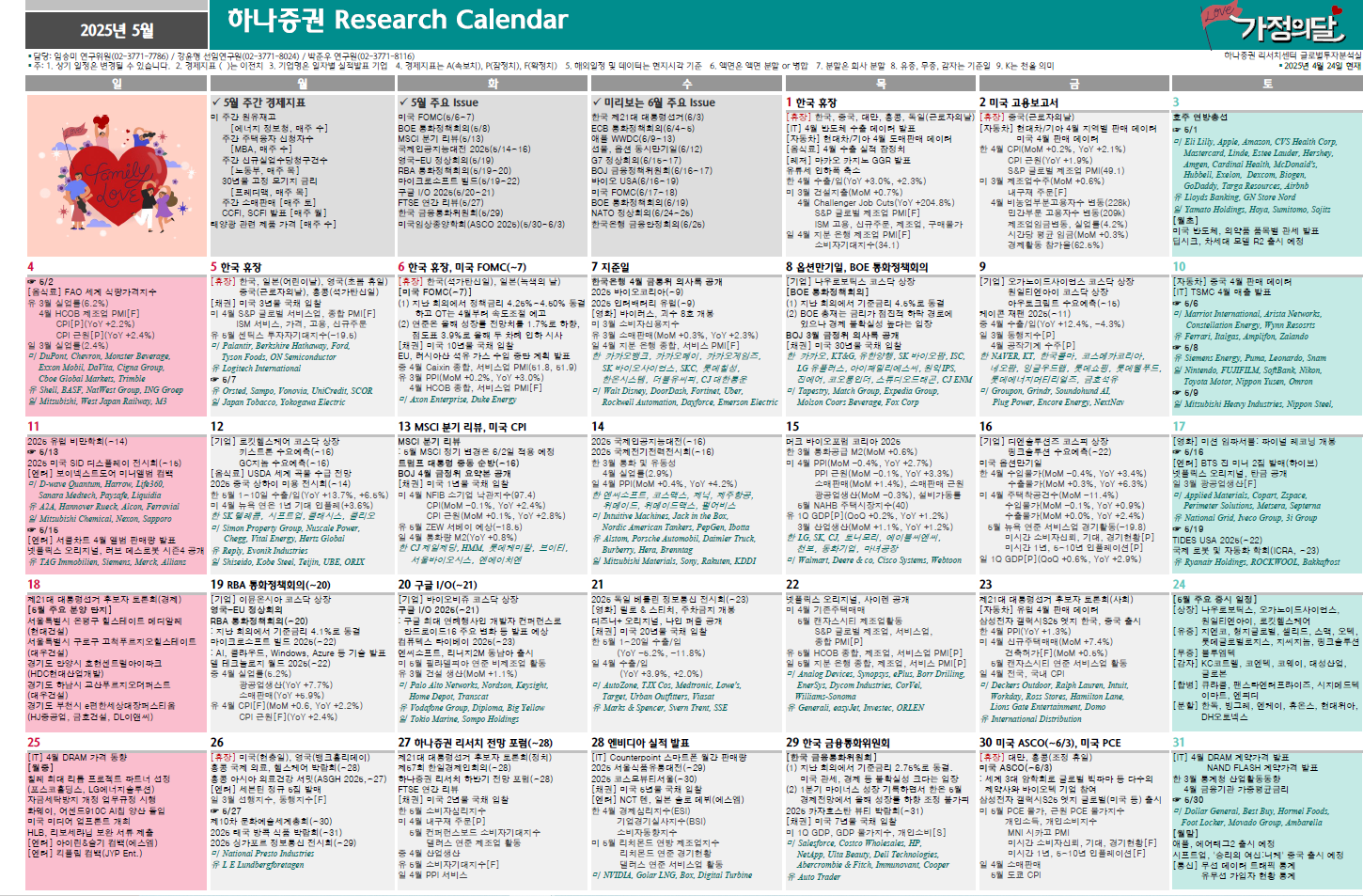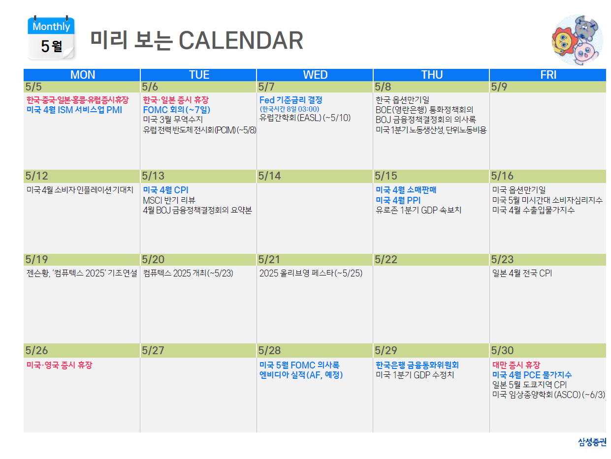 05/02(금) 한국: 소비자물가지수 유로존: 소비자물가지수 미국: 고용보고서 실적 장전: 엑손모빌(XOM), 쉐브론(CVX), 시그나(CI), 마그나(MGA), 아르셀로메탈(MT) 휴장: 중국