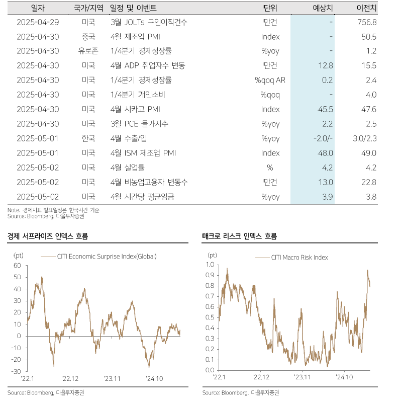 주간 주요 일정 월요일: 주말 트럼프의 발언, 캐나다 하원 선거 화요일: 소비행태 관련 기업 실적과 경제지표 수요일: MS, META, CAT 등 중요 기업 실적 발표 목요일: AAPL, AMZN, LLY 등 중요 기업 실적 발표 금요일: 고용보고서 둔화와 실업률 주목