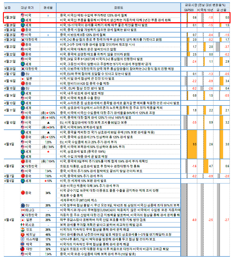 트럼프 미 대통령이 중국에 80% 관세가 적절한 것 같다고 언급한 가운데 백악관 대변인은 트럼프의 80% 관세는 단순한 숫자에 불과할 뿐이라고 주장. 더불어 미-중 협상에서 가능한 최선의 거래를 달성하기 위한 노력을 할 것이라고 주장. 다만, 일방적으로 관세 인하는 없을 것이라고 언급. 이와 함께 트럼프 대통령은 배센트 재무장관을 전적으로 신뢰한다고 언급해 관세에 온건파인 베센트 장관에 힘을 싣는 모습.