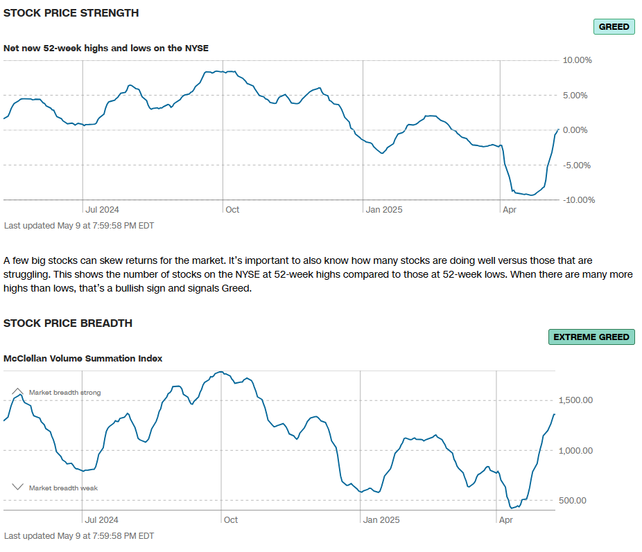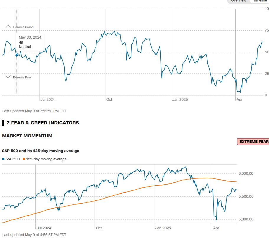 11 개 섹터 중 에너지(+1.0%), 부동산(+0.6%), 경기소비재(+0.6%) 등 7 개 섹터 상승 마감에 성공. M7 업종을 비롯 대부분의 대형주 들이 관망세 유지하며 제한적 등락 유지한 가운데 테슬라(+4.7%)는 전일 급등에 이어 랠리 지속하는 모습. 영국과의 공식적인 무역협상 등 전환된 무역 정책 기조에 따른 기대감 몰리는 모습. CNN 공포탐욕지수도 62pt 로 탐욕 구간에 위치. [4/23 극도의 공포 구간 탈 출 이후 회복세 지속]