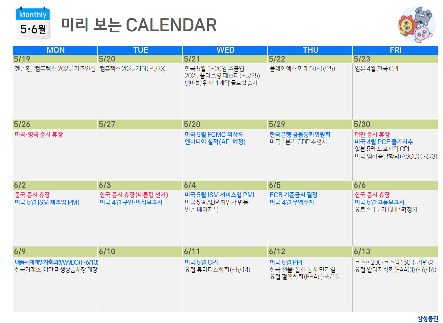 애플(AAPL +1.02%)은 가을에 기존 아이폰보다 더 앏은 제품을 출시할 것이라는 소식이 전해지며 상승. 미-중 관세 협상의 영향도 지속. 더 나아가 일부 신기술 연구 소식 등도 강세 요인. 알파벳(GOOGL +0.82%)은 웨드부시가 추천 종목에서 제외했다는 소식과 일부 투자사가 광고 수익 감소를 예상하며 매도 했다는 소식에도 상승. 특히 중국과의 관세 협상 후 견조한 모습. 아마존(AMZN +1.31%)과 메타 플랫폼(META +2.60%)은 중국과의 관세 협상 후 상승 지속. 아마존의 경우 저가형 상품 판매 제약에서 해제된 점, 메타는 중국 기업들의 광고 증가 등을 반영한 것으로 추정. MS(MSFT -0.03%)는 전체 인력의 3%를 감축한다고 발표하자 하락.