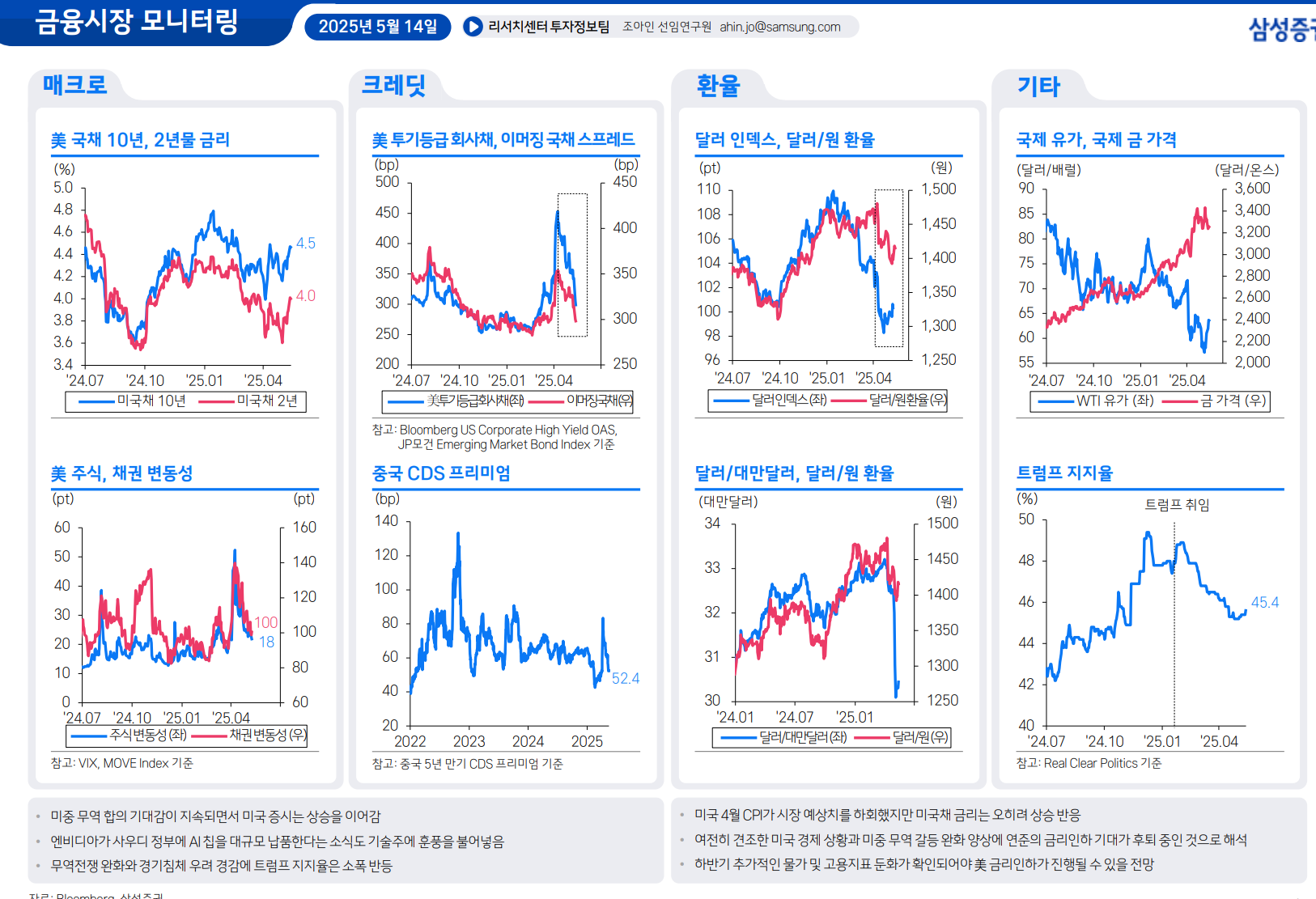 한편, 소비자물가지수가 발표됐는데 전월 대비 -0.05%에서 0.22% 상승을 보임. 시장 예상(+0.3%)보다 낮은 수준. 근원 소비자 물가지수는 전월 대비 0.06%에서 0.24% 상승. 대체로 물가가 관세 부과에도 안정. 다만 핵심 서비스가 0.11%에서 0.29%로 상승한 가운데 시장에서는 6,7월로 넘어가면 관세 영향으로 물가 상승이 확대될 것으로 전망. 그럼에도 물가 안정이 진행되고 있다는 점에서 달러화가 약세를, 국채 금리는 발표 직후 제한적인 하락. 한편, 국채 금리는 장중 10년물 기준 4.5%를 넘어서기도 했는데, 이는 일부 모멘텀 투자를 하는 CTA 펀드가 장기물을 매도하는 등 수급에 의한 결과로 추정돼 물가 영향은 제한. 주식시장에 대한 영향 또한 제한. MSCI 한국 증시 ETF는 0.14%, MSCI 신흥지수 ETF는 0.17% 상승. 시간 외로는 각각0.3%, 0.2%대 상승 중. 필라델피아 반도체 지수는 3.15% 상승한 가운데 러셀2000지수는 0.49%, 다우 운송지수도 0.26% 상승. KOSPI 야간 선물은 0.72% 상승. 전일 서울 환시에서 달러/원 환율은 1,416.00원을 기록한 가운데 야간 시장에서는 1,416.30원을 기록. NDF 달러/원 환율 1개월물은 1,412.90원을 기록. *FICC: 국채 금리, 모멘텀 투자 관련 CTA 펀드 수급 영향으로 장기물 상승