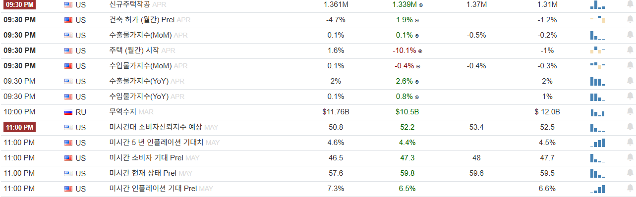 ✅5월 14일(수) ▪️ 미국, 주간 MBA 모기지 신청건수 ▪️ 미국, 주간원유재고 ▪️ 독일, 4월 CPI 확정치 ▪️ 일본, 4월 PPI ▪️ OPEC, 월간보고서 ▪️ 한국 국제인공지능대전 ▪️ 반도체 소재 컨퍼런스(SMC 코리아) ▪️ 오름테라퓨틱 보호예수 해제(7.49%) ▪️ 윤성에프앤씨 보호예수 해제(58.41%) ▪️ 미국 실적발표) TCEHY, CSCO, SONY ✅5월 15일(목) ▪️ 미국, 4월 생산자물가지수(PPI) ▪️ 미국, 4월 소매판매 및 산업생산 ▪️ 미국, 5월 필라델피아 연준 제조업지수 ▪️ 미국, 5월 뉴욕주 제조업지수 ▪️ 미국, 3월 기업재고 ▪️ 미국, 5월 NAHB 주택시장지수 ▪️ 유로존, 1분기 GDP(국내총생산) 잠정치 ▪️ 유로존, 3월 산업생산 ▪️ 영국, 1분기 GDP(국내총생산) 예비치 ▪️ 티씨머티리얼즈, 스팩합병 상장 ▪️ 한화에어로스페이스 유상증자 추가상장 ▪️ 미국 실적발표) WMT, BABA, DE, AMAT, NTES, FUTU, BBWI, CSIQ, TE ✅5월 16일(금) ▪️ 미국, 옵션만기일 ▪️ 미국, 4월 주택착공 및 건축허가 ▪️ 미국, 4월 수출입물가지수 ▪️ 미국, 5월 미시간대 소비심리 평가지수 ▪️ 미국, 주간 원유 채굴장비 수 ▪️ 유로존, 3월 무역수지 ▪️ 일본, 1분기 GDP 예비치 ▪️ 한국, 4월 수출입물가지수 및 무역지수 ▪️ 바이오포트코리아 스팩합병상장 ▪️ 미국 실적발표) X