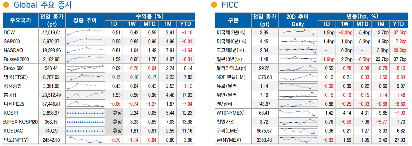 그러나 미국 경제지표 발표 후 경기 불안을 뒤로하고 주식시장은 상승 전환 후 확대. 4월 채용 공고는 감소할 것이라는 예상과 달리 720만 건에서 739.1만 건으로 증가. 전문 비즈니스(+17.1만 건)와 사립교육 및 의료서비스(+11.5만 건)이 증가한 반면, 숙박 및 음식 서비스(-13.5만 건), 정부 교육(-5.1만 건) 등은 감소. 신규 채용과 총 이직은 큰 변화가 없었으며 이직과 해고 또한 변화가 제한. 관세 이후 채용 공고라는 점에서 시장은 위축 우려가 높았지만, 오히려 견조함을 보이자 달러 강세, 국채 금리 상승, 주식시장 상승이 진행한편, 관세 관련 기대가 높아진 점도 주식시장에 우호적. 장 시작 전 중국 외교관이 주중 미국 대사를 만나 양국간의 건전하고 안정적인 지속 가능한 미래를 촉진하기를 희망한다는 내용을 언급했다는 보도가 나오며 기대 심리가 높아짐. 이런 가운데 전일 언급됐던 트럼프와 시진핑의 전화 통화를 앞두고 있다는 점이 백악관 대변인을 통해 확인. 더불어 상호관세 유예를 앞두고 이번주까지 각국의 협상안 제시 촉구로 협상 속도가 빠르게 전개될 수 있다는 기대 심리도 부각. 이렇듯 관세 이슈가 완화되고 경기에 대한 우려가 제한되자 상승세는 진행. 다만, 장 후반 백악관 대변인이 철강 관세 관련 행정명령을 오늘 서명한다고 발표하자 매물 출회되는 등 변화는 여전 MSCI 한국 증시 ETF는 전일 1.83% 상승에 이어 0.24% 상승. MSCI 신흥지수 ETF는 전일 0.72% 상승에 이어 0.24% 상승. 필라델피아 반도체 지수는 1.57% 상승에 이어 오늘도 2.72% 상승. 러셀2000지수는 1.50%, 다우 운송지수는 0.99% 상승. KOSPI 야간 선물은 휴장인 가운데 전일 1.11% 상승. 서울 환시에서 야간 시장이 휴장인 가운데 전일 야간 시장 달러/원 환율은 1,377.10원을 기록. 오늘 NDF 달러/원 환율 1개월물은 1,376.30원을 기록 새로운 정부가 시작되며 금융 정책에 대한 관심이 집중. AI 등 신산업 집중육성, K-콘텐츠 지원강화. 상장기업 특성에 따른 주식시장 재편 및 주주환원 강화와 외국인 투자자 유입 확대를 위한 제도 정비 및 MSCI 선진국지수 편입 적극 추진. 상법상 주주충실 의무 도입 등 기업지배구조 개선 통한 일반주주의 권익 보호, 디지털자산 생태계 정비를 통한 산업육성기반 마련, 재생에너지 중심의 에너지전환 가속화 등 많은 정책이 공약에 담겨 있음. 다만, 관련 부분은 많은 부분 선반영이 되어 왔던 점을 반영 단기적인 매물 소화 과정이 진행될 것으로 시장은 예상. 중장기적으로는 이러한 정부 공약도 중요하지만, 수출 의존도가 높은 한국 경제 특성상 글로벌 경제에 더 밀접한 반응을 보이기 때문에 글로벌 경제 지표 등에 따른 변화에 더 주목해야 할 것으로 판단.