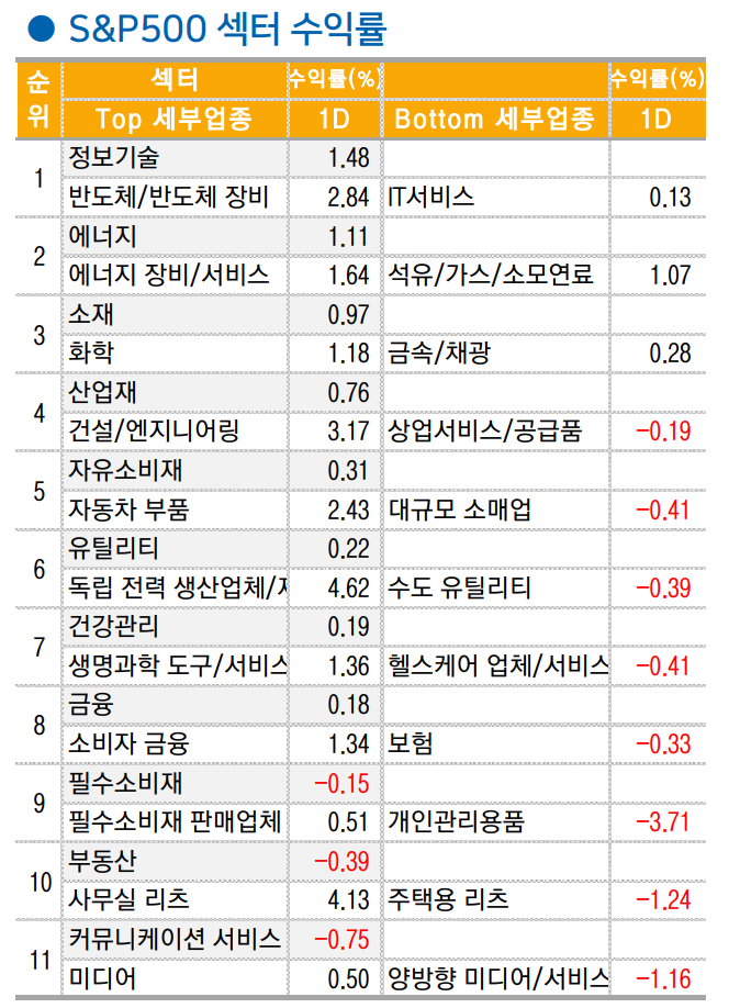기술주와 중소형주 중심의 강세. 증시가 6,000pt 를 앞두고 저항을 받는 가운데 엔비디아를 비롯한 실적과 주가 모멘텀이 견조한 종목들 중심 으로 양호한 실적. 반도체(SOX, +2.7%) 중심의 IT(+1.5%)가 가장 아웃 퍼폼했으며 소재(+1.0%), 산업재(+0.8%) 등이 고용지표 호조 반영하 며 강세. 반면 컴스(-0.8%), 부동산(-0.4%), 필수소비재(-0.2%)는 언더 퍼폼