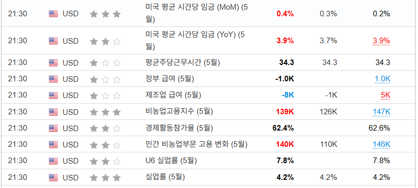 비농업고용지수, 미국 5월 비농업 고용자수는 지난달 13.9만 건을 기록해 시장 예상(12.6만 건)을 상회했는데 교육 밀 의료서비스가 8.7만 건 증가하며 이를 주도. 5주 이하 실업자는 26.4만 건 증가한 가운데 27주 이상의 실업자는 21.8만 건 감소. 특히 단기적인 구조조정이 증가하고 27주 이상 실업자는 고용시장을 떠남. 이에 고용참여율이 낮아져 실업률은 4.2%를 유지했으며 시간당 임금이 0.2%에서 0.4%로 상승. 시간당 임금 상승으로 연준의 금리 동결 기간 장기화 가능성이 높아져 달러 강세, 특히 금리 급등이 진행. 여기에 견조한 비농업고용자수 결과가 경기에 대한 자신삼을 보여줘 주식시장도 상승