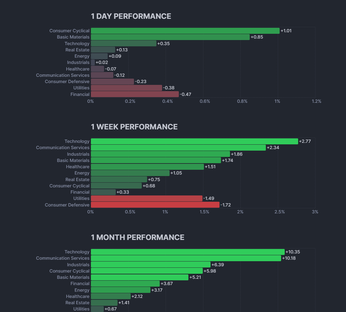 11 개 섹터 중 테슬라(+4.6%)가 주도한 경기소비재와 소재, IT, 에너지 등 5 개 섹터 상승 마감. 반도체, 반도체 S/W, 항공기 등 협상 카드로 활용될 수 있는 영역들은 매물 일부 출회되었으나 기대감 유지하며 강세 지속. 그 외 영역들은 향후 방향성과 5 월 CPI 등을 대기하며 관망세