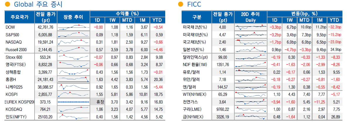 미국과 중국의 무역 협상이 영국에서 시작. 특히 일부 언론에서 트럼프가 무역 협상을 앞두고 중국 대상 기술 및 제품 판매 제한 해제 협상 권한을 부여했다고 보도. 이는 결국 반도체 수출 통제 완화를 비롯해 많은 부분이 협상에 나올 수 있다는 기대가 부각. 관련 소식이 반도체 업종의 상승을 견인. 더불어 중국 기업들, 자동차, 에너지, 기계 등의 강세도 뚜렷한 모습을 보임. 장 후반에는 미-중 협상이 이틀째로 넘어갔다는 소식에 협상에 대한 불안 심리가 유입되기는 했지만 기대감 또한 여전. 실제 베센트 재무장관은 좋은 회의였고, 루트닉 상무장관도 성과가 있었다고 언급. 다만, 주식시장은 장 마감 앞두고 일부 매물 소화한편, 골드만삭스의 발표에 따르면 지난 주에 중국에서 미국으로 화물이 9% 증가했다는 점은 주목. 관세 유예기간 많은 미국 기업들이 재고를 쌓고 있을 것이라는 기대심리를 반영. 그동안 과도한 관세로 개학 시즌과 연말 쇼핑 시즌 매장이 비는 사태가 발생할 수 있다는 경고가 있었으나, 물동량의 증가는 향후 수요와 물가에도 영향을 줄 수 있어 주목. 관세 협상 결과에 따라 주간 단위의 물동량의 급격한 변화가 예상되기 때문에 주의할 필요가 있음. MSCI 한국 증시 ETF는 1.39% 상승한 가운데 MSCI 신흥지수 ETF는 0.85% 상승. 필라델피아 반도체 지수는 1.96% 상승. 러셀2000지수는 0.57%, 다우 운송지수는 0.67% 상승. KOSPI 야간 선물은 미 증시 마감 당시 0.41% 상승(오전 5시 기준, 종가는 오전 6시). 전일 서울 환시에서 달러/원 환율은 1,356.40원을 기록한 가운데 야간 시장에서는 1,354.20원으로 마감. NDF 달러/원 환율 1개월물은 1,351.85원을 기록. 국제유가는 미-중 무역 협상에 대한 낙관론과 드라이빙 시즌 수요 증가 기대에 힘입어 상승. 여기에 달러화의 약세 또한 긍정적인 영향 속 WTI 기준 한 때 65달러를 상회. 미국 천연가스는 봄철 정기 보수로 LNG 수출 플랜트로의 천연가스 공급이 감소하고 있다는 평가에 4% 하락. 유럽 천연가스도 2%대 하락 [달러화는 미-중 무역협상에 대한 기대가 확대된 가운데 여타 환율에 대해 약세.] 더 나아가 이번주 발표되는 소비자 물가지수에 대한 기대가 높아져 있는 가운데 뉴욕 연은이 소비자 기대조사에서 올해 물가 상승률이 4월 3.6%에서 5월 3.2%로 하향 조정하자 약세가 확대. 유로화는 미-중 무역 협상의 진전을 주시하며 달러 대비 강세. 엔화는 1분기 GDP 성장률이 변동이 없었는데 기존 추정치인 0.2% 감소에서 개선된 결과에 달러 대비 강세. 역외 위안화는 달러 대비 강세를 보인 가운데 멕시코 페소, 브라질 헤알 등 대부분이 강세 국채 금리는 뉴욕 연은의 소비자 기대조사에서 2025년 기대 인플레이션이 3.6%에서 3.2%로 하향 조정하자 하락. 더불어 중국의 물가가 낮아진 가운데 미국으로의 수출이 34.4% 감소한 점도 금리 하락 요인. 특히 단기물이 장기물보다 크게 하락한 점도 특징. 다만, 장 후반 미-중 무역 협상이 둘째날로 미뤄졌다는 소식에 하락폭이 일부 축소