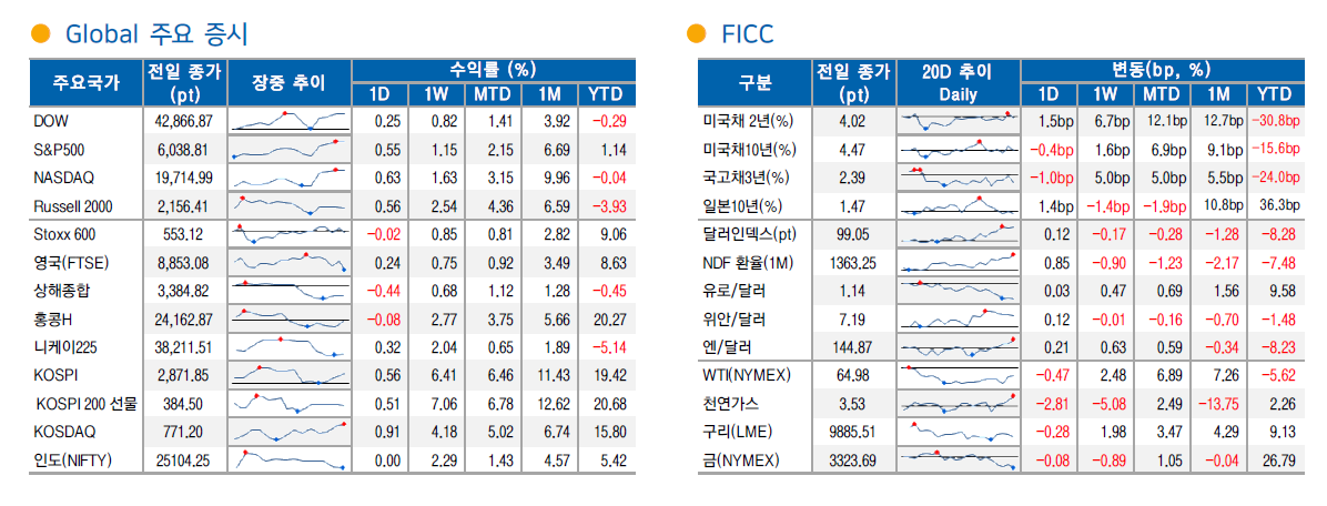 미-중 무역협상이 진행 중. 루트닉 상무장관은 긍정적이라고 언급하며 회의는 긴 시간이 걸릴 것이라고 주장. 다만, 마무리가 되어가고 있다는 소식과 함께 장중에는 기술적인 세부사항을 조율하고 있다는 내용이 보도되며 미 증시의 상승을 견인. 시장은 이번 협상에서 전면적인 타결 가능성은 낮은 가운데 특정 품목 즉 반도체 등에 대한 규제 완화 등은 합의 가능성이 높은 것으로 기대. 여기에 농산물 수입 확대, 금융시장 개방 등도 기대. 다만, 첨단 기술과 관련된 수출 통제 등은 쉽지 않을 것으로 전망. 장 마감 앞두고는 루트닉 장관이 회담이 아주 순조롭게 진행되고 있으며 오늘 종료되기를 바라지만, 회담을 내일까지 미뤄질 수 있다고 주장하자 주식시장 상승 진행