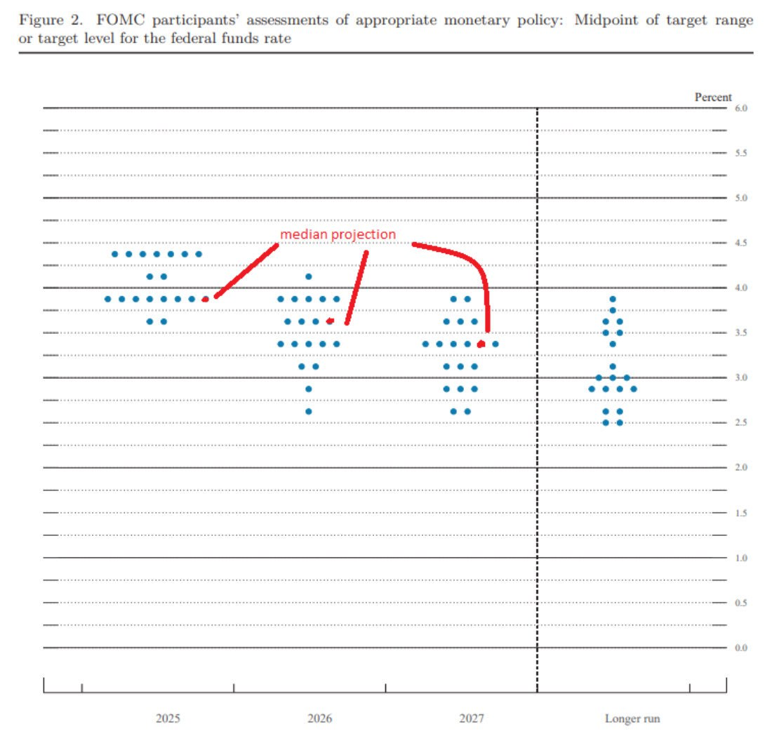 2027년도 중간값도 3월보다 25bp 상향조정. 단, 2026년 대비 추가 1회 인하가 적절하다는 인하 경로는 유지. 2명만 점을 아래 찍었다면 3월에 제시한 3.25%를 유지할 수 있었음