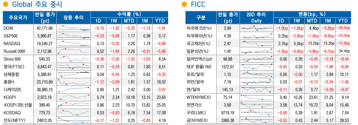 다만 장 마감 앞두고 트럼프의 협상 발언으로 재차 반등하는 등 변동성이 확대(다우 -0.10%, 나스닥 +0.13%, S&P500 -0.03%, 러셀2000 +0.52%, 필라델피아 반도체 지수 +0.52%)