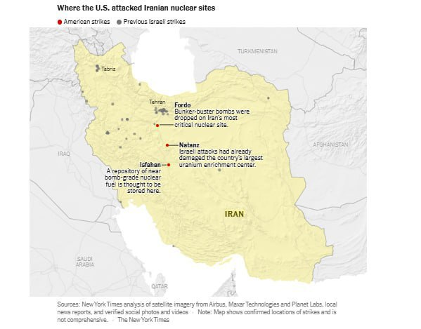 ▪️이란도 이스파한, 나탄즈, 프로도의 핵 시설이 미국의 공습을 받았다고 인정했지만 농축 우라늄을 모두 대피시켰다고 다시 확인하며 피해가 제한적이라는 선전을 하고 있다.