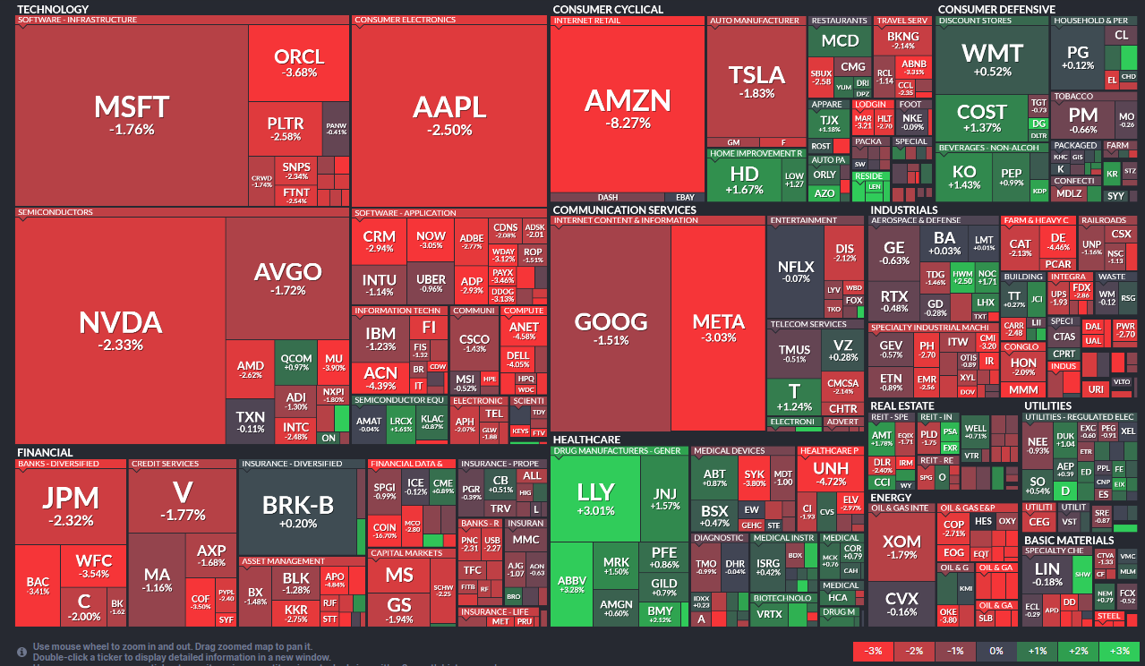 기술 섹터가 관세 정책과 중국 경제 둔화 우려로 가장 큰 타격을 받았습니다. 특히 중국 의존도가 높은 하드웨어 기업들이 큰 폭으로 하락했습니다.