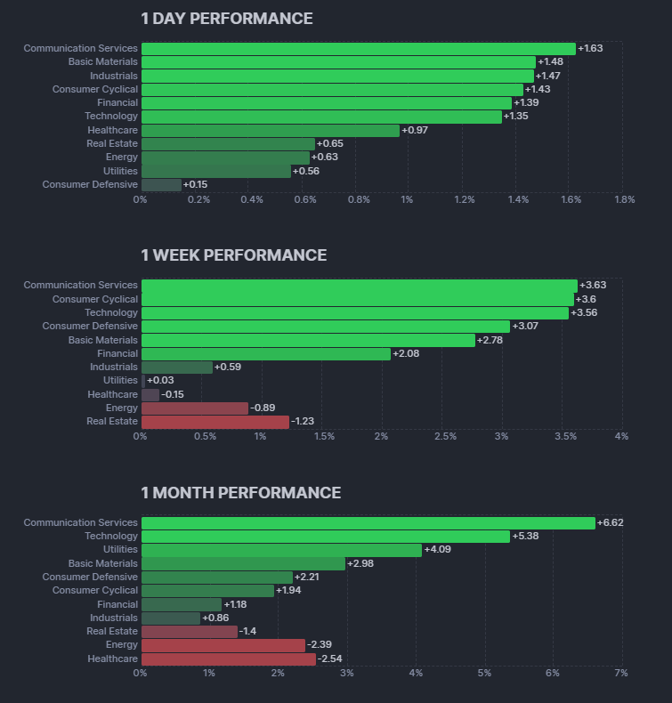 금리인하 기대감과 함께 성장주 성격의 통신서비스 섹터가 가장 큰 상승폭을 기록했습니다. 특히 소셜미디어와 스트리밍 서비스 업체들이 강세를 보였습니다.