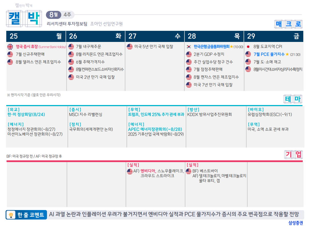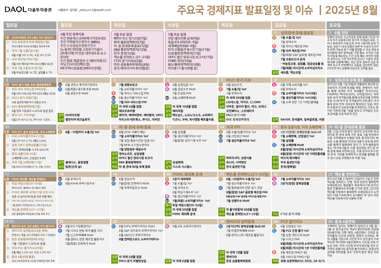 - ⭐ PCE 인플레이션 지수: 7월 데이터 발표 예정 (연준이 가장 주목하는 인플레이션 지표)