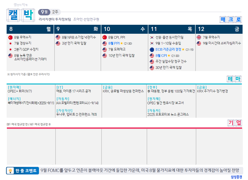 - ⭐ 미국 8월 CPI 발표 (+2.6% YoY 예상, 핵심 지표)