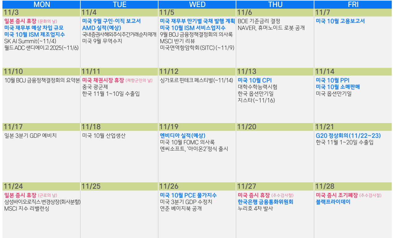 연준은 FOMC에서 정책금리를 25bp 인하하며, 양적 긴축(QT)을 12월 1일 종료한다고 발표했습니다. 이는 시장 예상과 부합했으며, 경제활동에 대해 “적당한 속도로 확대되고 있다"고 평가하며 약간 더 긍정적인 톤을 보였습니다. 고용시장은 일자리 증가 둔화를 언급하며 유지, 물가는 여전히 높은 수준이라고 평가했습니다.