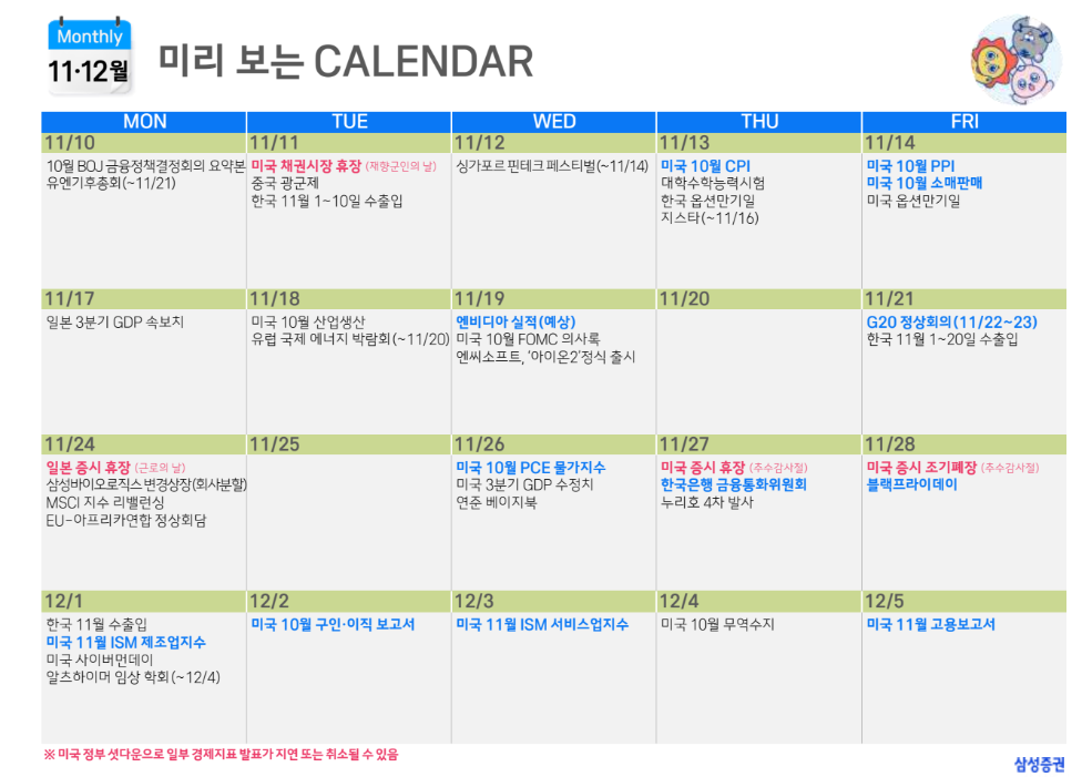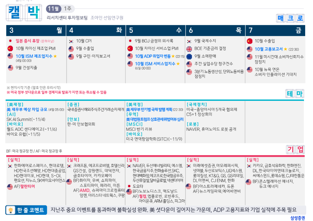 - 정부 셧다운: 트럼프 미 대통령이 셧다운 사태와 관련해 다소 완화된 태도를 보이며 ‘대화 가능성’을 언급하고 있습니다. 11월 4일 역대 최장 기록을 경신할 것으로 예상되는 셧다운 이슈가 시장에 어떤 영향을 미칠지 주목됩니다.