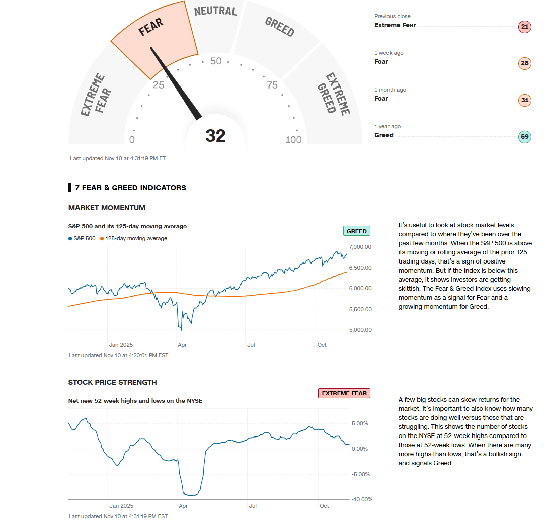 - CNN 심리 - 매수 (📈) / 시장 - 하락 (📉)