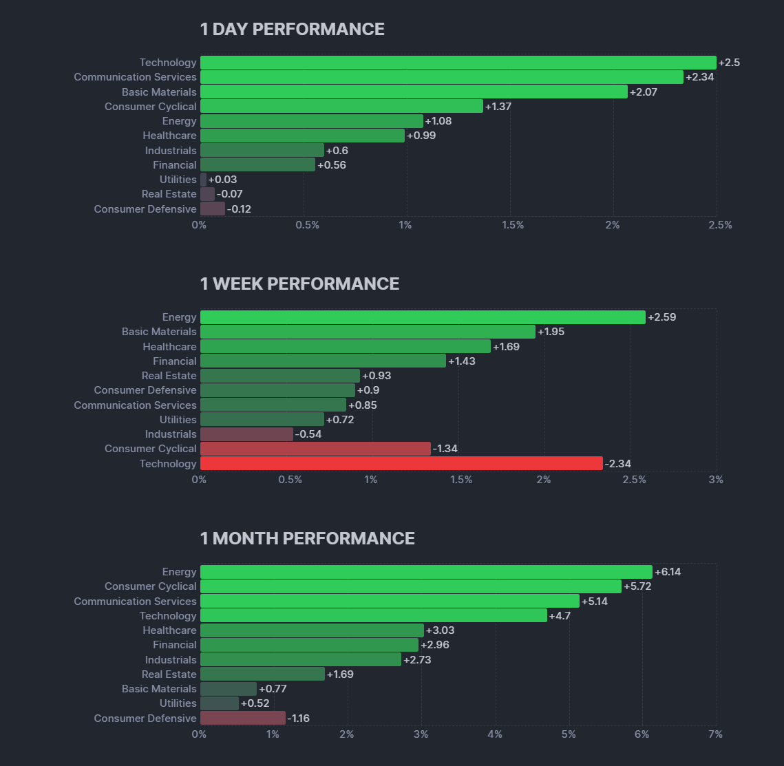 - Consumer Discretionary Select Sector SPDR Fund (XLY): +1.25% 상승. 테슬라와 리비안 등 전기차 기업들의 강세가 섹터를 지지했습니다.