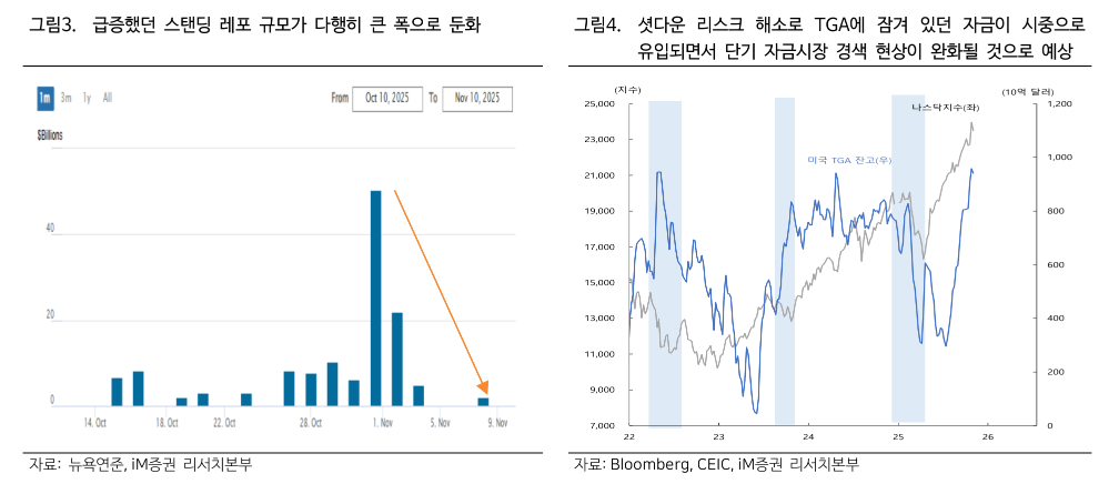 40여일간 지속된 셧다운 사태가 금주 해결될 가능성이 커지면서 단기 자금시장 경색 현상도 점차 완화되거나 단기적으로 유동성 랠리가 재개될 것으로 기대된다. 셧다운 해제에 따라 그 동안 이연되었던 연방지출이 재개되면서 단기 자금시장에 숨통을 터줄것이기 때문. 미국 의회예산국은 6주 정도 셧다운 지속 시 재정지출 지연규모는 약 540억 달러 수준에 이를 것으로 추정한 바 있다. 따라서 셧다운 사태가 해소되면서 재정자금이 풀리면서 유동성이 단기 자금시장에 유입될 공산이 높다. 즉, 당사가 그동안 단기 자금시장 경색 원인 중에 하나로 지적했던 미 재무부의 TGA잔고 규모가 크게 축소되면서 시중 유동성 흐름이 크게 개선될 수 있음을 시사한다.
