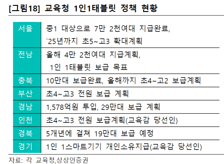 • 19,20년도에는 재택근무 증가로 인한 노트북 수요가 IT렌탈 실적을 견인했으며, 지금은 [각 교육청에서 1인 1태블릿 정책을 추진 중]에 있다. 실제로 1인당 1태블릿 보급이 이뤄진다면, 사업비 규모가 누적 2조원에 이를 전망이다.2022년 4월1일 기준 실제 학생수는 527만5054명[2029년 약 425만명대로 낮아질 예정 - 인구감소 영향]