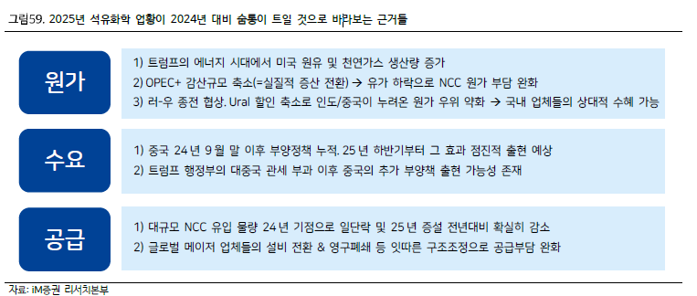 - 2025년 석유화학 업황이 2024년 대비 숨통이 트일 것으로 바라보는 근거  1) 원가 측면 1) 트럼프의 에너지 시대에서 미국 원유 및 천연가스 생산량 증가 2) OPEC+ 감산규모 축소(=실질적 증산 전환) → 유가 하락으로 NCC 원가 부담 완화 3) 러-우 종전 협상. Ural 할인 축소로 인도/중국이 누려온 원가 우위 약화 → 국내 업체들의 상대적 수혜 가능 2) 수요 측면 1) 중국 24 년 9 월 말 이후 부양정책 누적. 25 년 하반기부터 그 효과 점진적 출현 예상 2) 트럼프 행정부의 대중국 관세 부과 이후 [중국의 추가 부양책] 출현 가능성 존재 3) 공급 측면 1) 대규모 NCC 유입 물량 24 년 기점으로 일단락 및 25 년 증설 전년대비 확실히 감소 2) 글로벌 메이저 업체들의 설비 전환 & 영구폐쇄 등 잇따른 구조조정으로 공급부담 완화기초정보 -석유화학제품생산계통도) -석유화학 용어 정리)