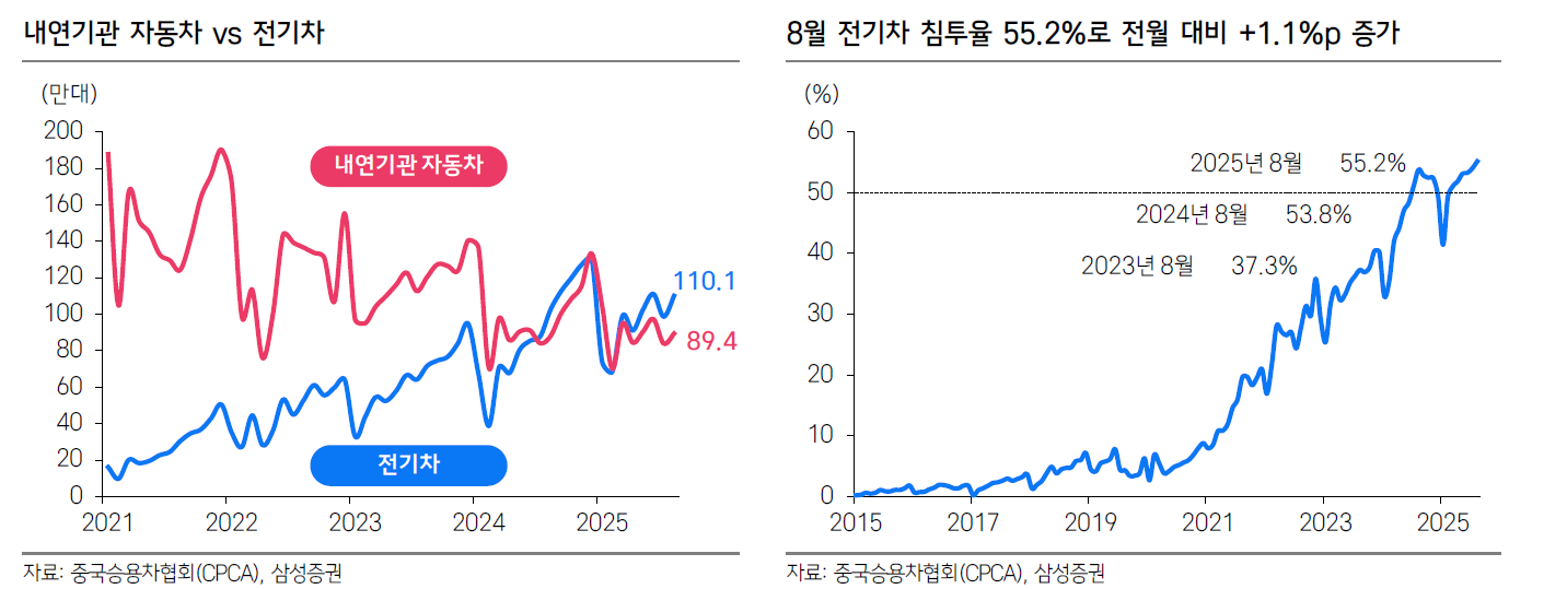 8월 중국 전기차 소매 판매는 110만 대(+7.3%YoY) 및 전기차 침투율 55.1%(+1.3%pYoY) 기록.