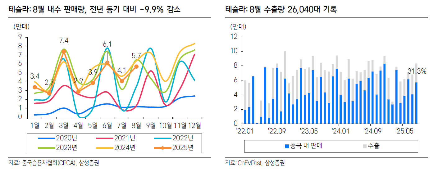 테슬라([TSLA[]]), 신차 효과는 9월부터: 8월 내수 판매는 5.7만 대(+40%MoM/-10%YoY) 및 수출 2.6만 대(-4.5%MoM/+12%YoY)를 기록하며, 올해 10위권 밖까지 밀려났던 M/S는 5위로 회복. 8월 중순 모델YL(6인승) 출시를 앞두고 대기 수요가 이어졌으며, 9월부터 모델 YL, 모델3+ 롱레인지 본격 인도 예정.
