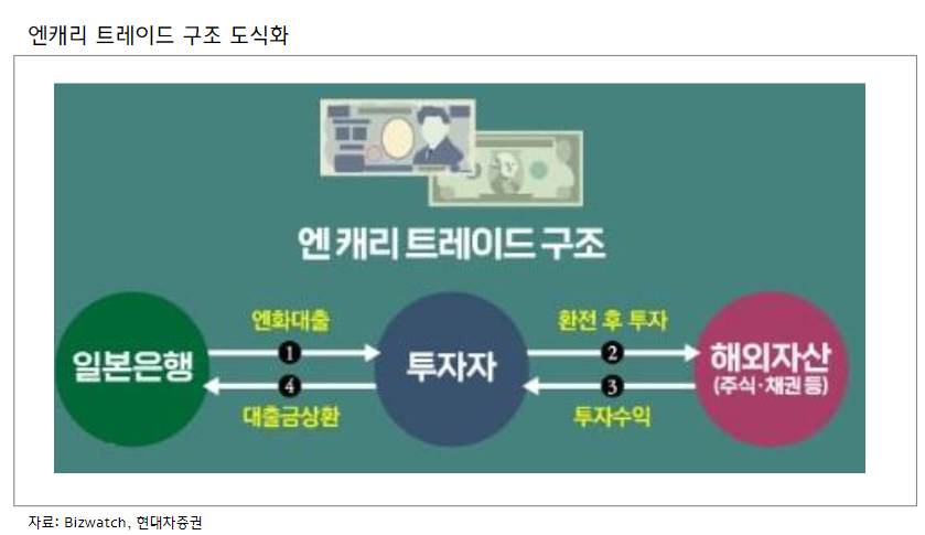 • 엔 캐리 트레이드는(Yen Carry Trade) 일본의 미국을 포함한 대외 금리차 축소 및 엔화 강세 구간 청산하게 됨(엔화 강세로 인해 환차손이 발생할 경우, 캐리트레이드가 비경제적으로 변함)